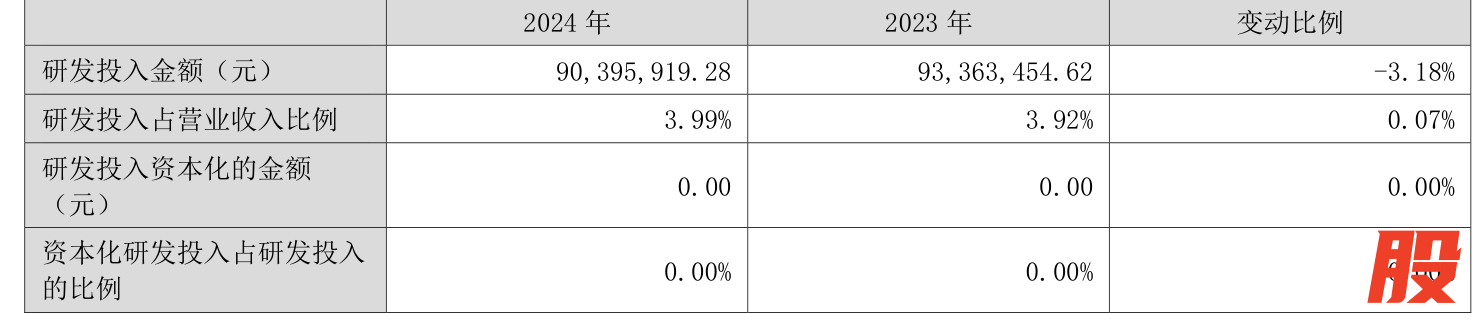 2024年全年闻喜,公司研发投入金额为9039.59万元,同比下降3.18%;研发投入占营业收入比例为3.99%,相比上年同期上升0.07个百分点。此外,公司全年研发投入资本化率为0%。
