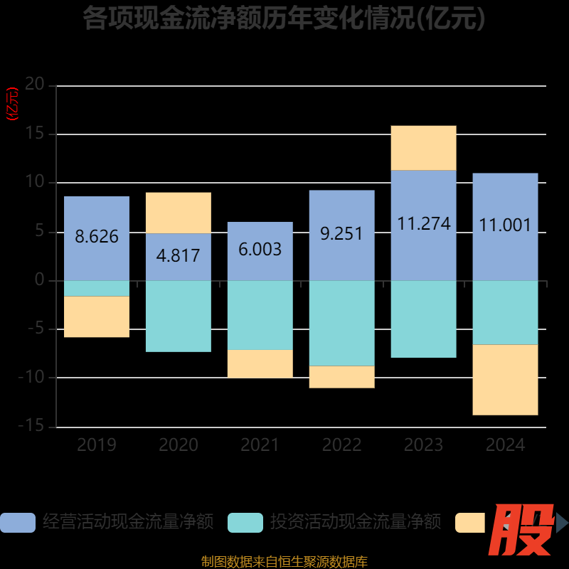 截至2024年,公司经营活动现金流净额为11亿元,同比下降2.42%;筹资活动现金流净额-7.24亿元,同比减少11.84亿元;投资活动现金流净额-6.57亿元,上年同期为-7.92亿元。