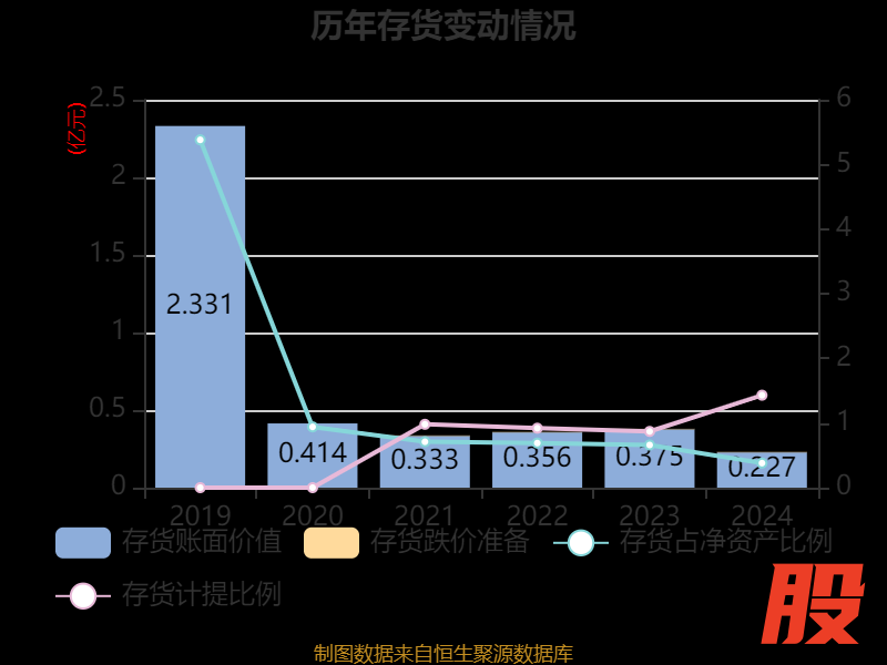 从存货变动来看,截至2024年末,公司存货账面价值为2266.62万元,占净资产的0.38%,较上年末减少1486.76万元。其中,存货跌价准备为33万元,计提比例为1.43%。